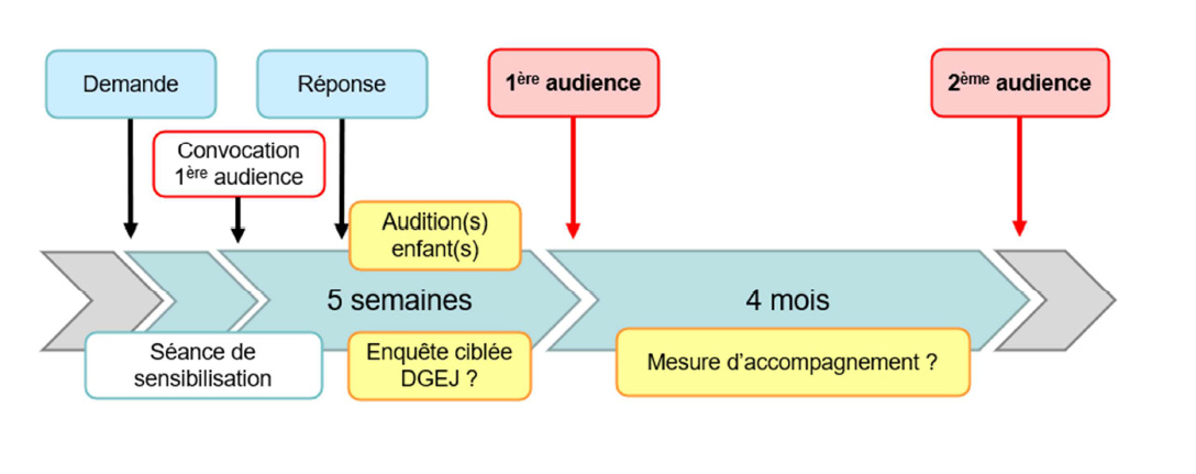 Le schéma des audiences prévoit une phase d’orientation suivie d’une phase de consensus parental, mobilisant jusqu’à 25 dossiers par session.